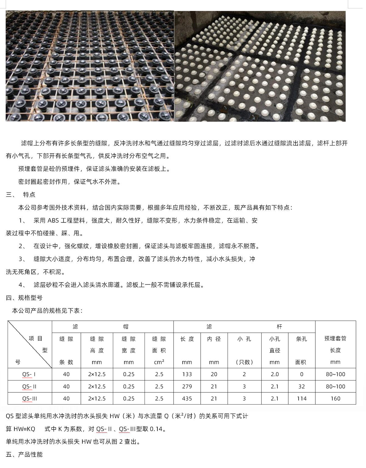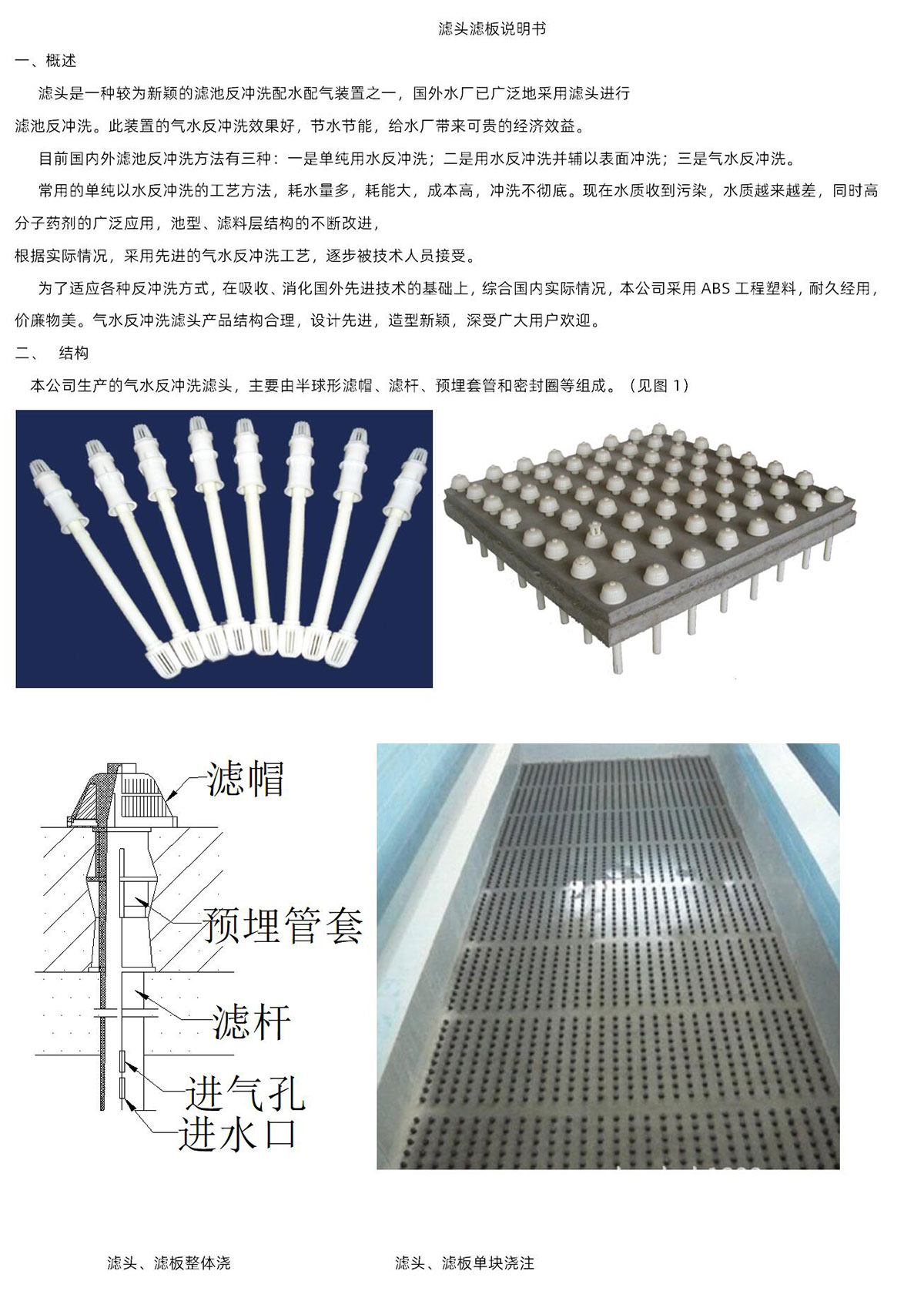 濾頭采用ABS工程塑料制造,由濾帽、濾帽座、濾桿、預埋管套、密封圈等五部分組成,濾頭分為長柄和短柄慮頭兩種、濾板采用鋼筋混凝土或ABS濾板制造為配合應用。